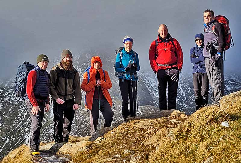 Dyma 7 ohonom, sef Andras, Alice, Dafydd, Elen, Gareth, Gwyn a finnau yn cyfarfod yng nghulfan hen lôn pentref Nant Gwynant am 9. Trwy lwc, newydd i'r glaw toreithiog y noson gynt darfod tua hanner awr yn gynharach. A’r glaw a olchodd ein mymryn o Fynydda gaeafol i ffwrdd !! Cychwyn wedyn yn ddi-stŵr am ac i fyny Llwybr Watkin nes cyrraedd y bont cerrig ar pistyll afon Cwm y Llan. Wedi i ni ei groesi, a dringo ychydig…. mi wnaethom feddwl y bysa fo wedi bod yn lle da am lun bach!!! Ond, erbyn hyn roedden wedi dringo gormod a neb yr awydd mynd yn ôl i lawr i ystun y camera!!! Ymlaen a ni i fyny ac i fewn i Gwm Merch nes cyrraedd y cyn safle mwyngloddio copr “Chwarel Cwm Erch” sy’n eistedd ar 1,500’/457 m ar lethrau deheuol Lliwedd.