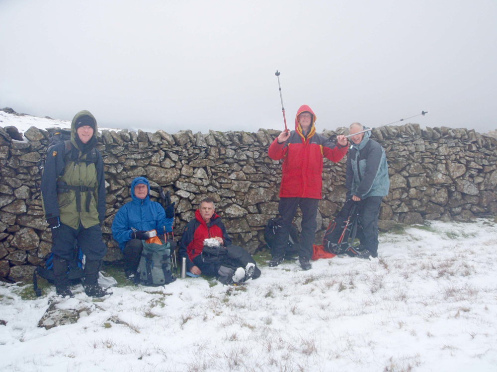 Taith o tua saith awr. Rhagolygon tywydd yn wael ond daeth pump dyn dewr i faes parcio Pandy i gychwyn ar y daith.