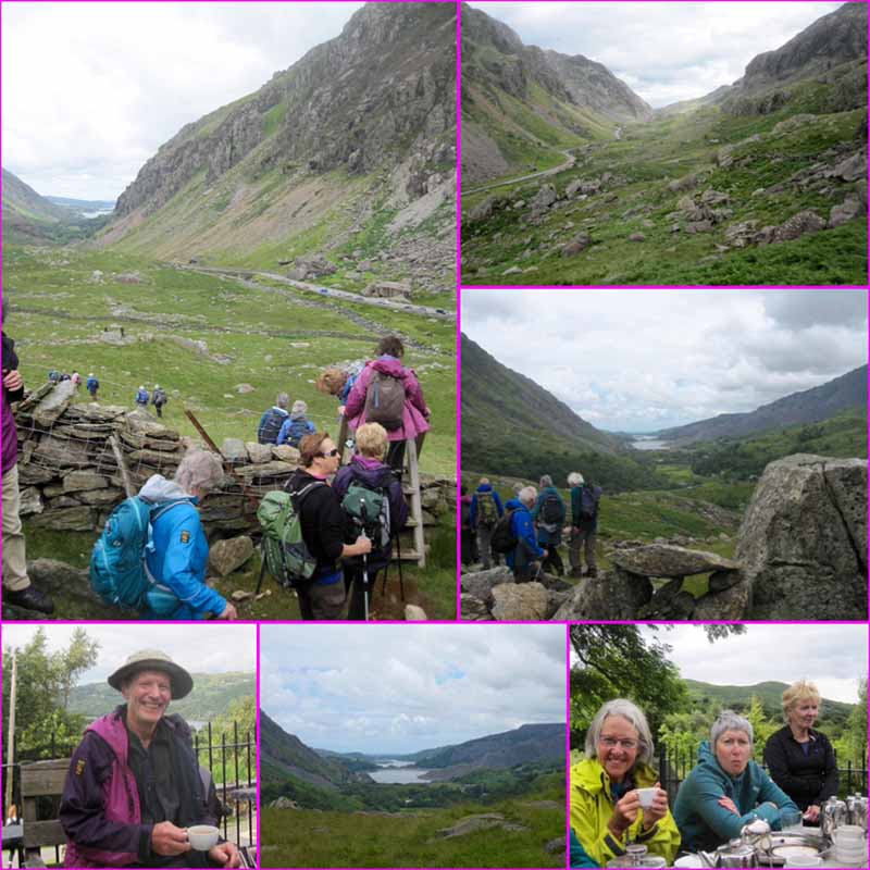 Felly i fyny'r bwlch at Ben y Pas ac ystafell te'r "YHA" yng Ngorffwysfa a 'phaned, cacen a chyfle i weld yr arddangosfa barhaol, ddwyieithog am hanes mynydda'r ardal. Yn anffodus roedd rhaid i un aelod ein gadael - dim ond yna am y daith bws a'r 'paned!