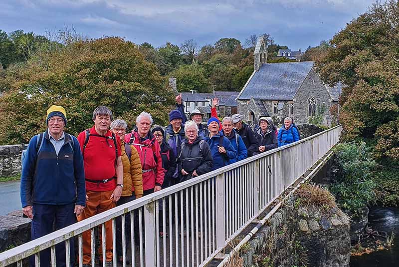 Rhai prydlon ydi criw dydd Mercher y Clwb, chwarae teg iddynt. Roedd pawb yn disgwyl bws Pwllheli mewn da bryd ger y Parc yn Porthmadog iddi’n cludo i Lanystumdwy. Rhaid oedd cael hyd i enw DLlG MP wedi ei naddu ar un o gerrig wal y bont gerllaw’r eglwys (llun yn y casgliad) cyn dechrau’r daith go iawn. Wedyn dilyn llwybr arfordir Cymru heibio ffarm Aberkin i lawr at geg yr afon Dwyfor ac ymlaen i Gricieth. Saib yno am baned ger cwt y bad achub cyn dilyn trac y trên at gyn-safle Black Rock Halt.