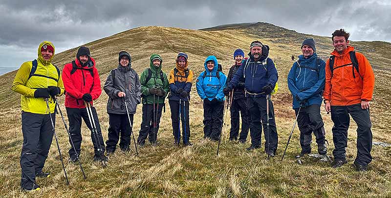 Tua hanner ffordd i fyny, dyma Ifan y Glaw yn penderfynu ymuno a’r daith, a fu rhaid cael stop bach sydyn i wisgo’r dillad glaw, cyn ail gychwyn ar y sgrialu tua’r copa! Dyma gyrraedd y copa toc wedi hanner awr wedi hanner dydd, lle penderfynwyd cael saib am ginio ynghanol y niwl er, diolch byth, roedd Ifan y Glaw wedi penderfynu ein gadael erbyn hyn- a diolch iddo am hynny!!