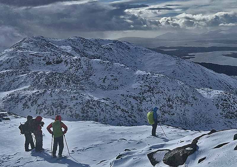 Er cychwyn mewn cawod o genllysg cafwyd ysbeibiau heulog a golygfeydd godidog draw am Mull. Roedd cerdded dros tri copa Beinn Sgulaird yn heriol, eira dros ein cluniau mewn llefydd a gwynt eithriadol o gryf yn y bylchau. Elen yn falch i gael Mark a Gethin fel ballast heddiw.